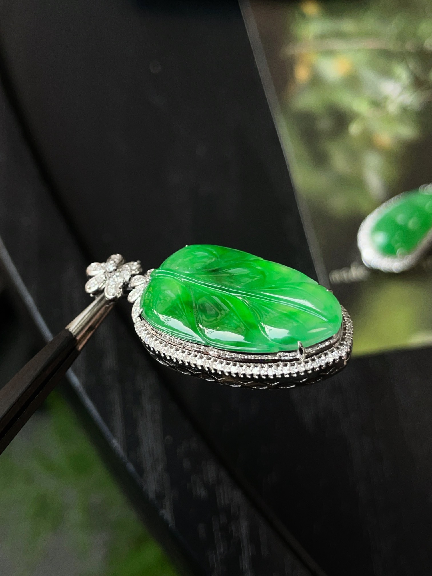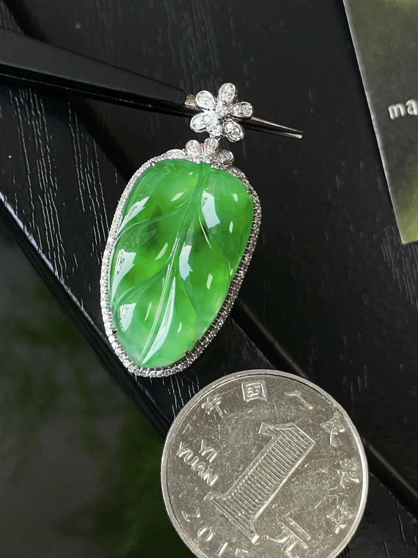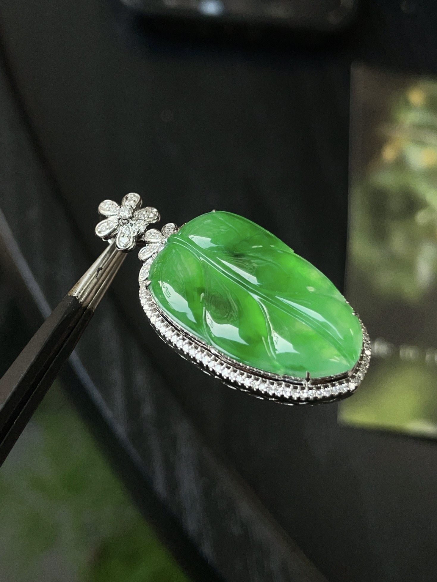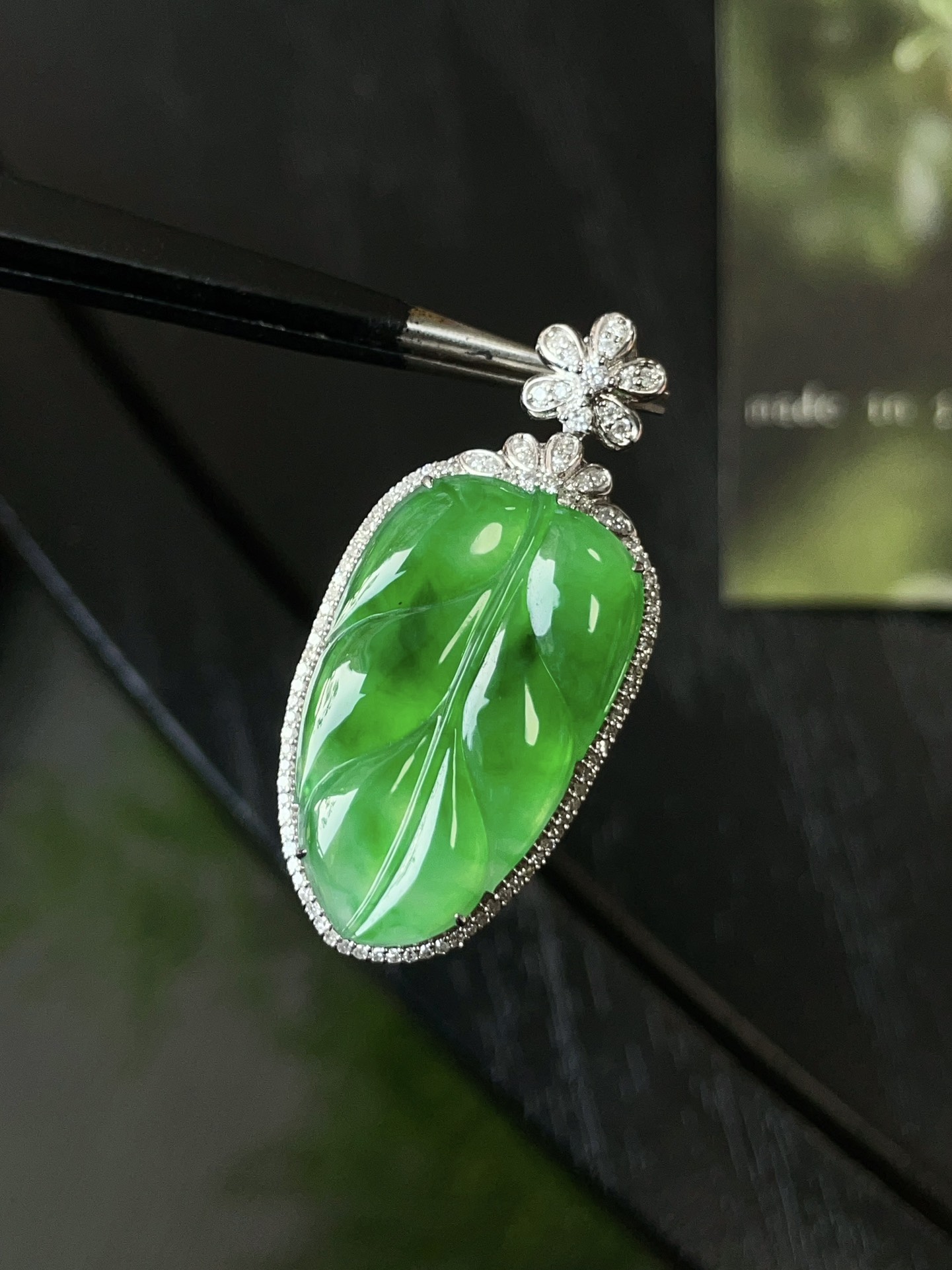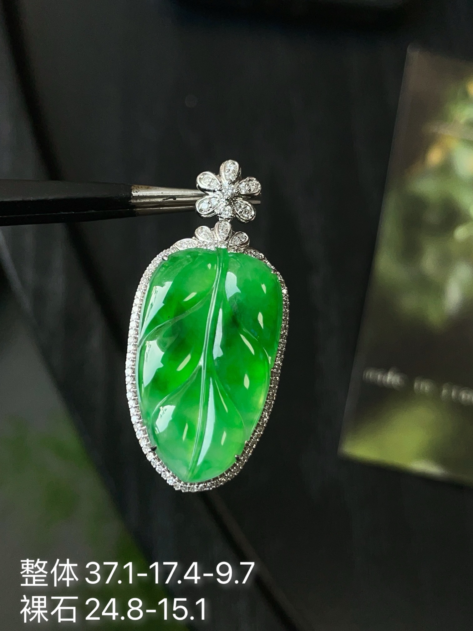 Jade pendant, 18k gold studded with green leaves pendant, overall: 37.1-17.4-9.7, bare stone: 24.8-15.1
